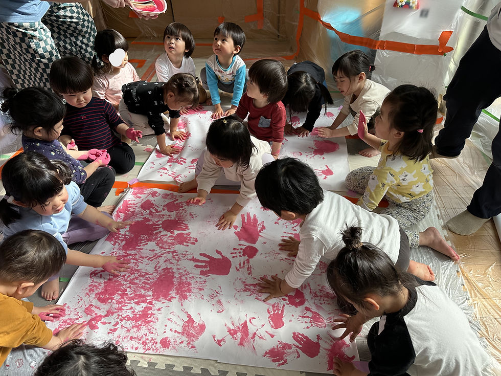 模造紙に様々な色でペタペタと手型を付けて楽しみました🎶