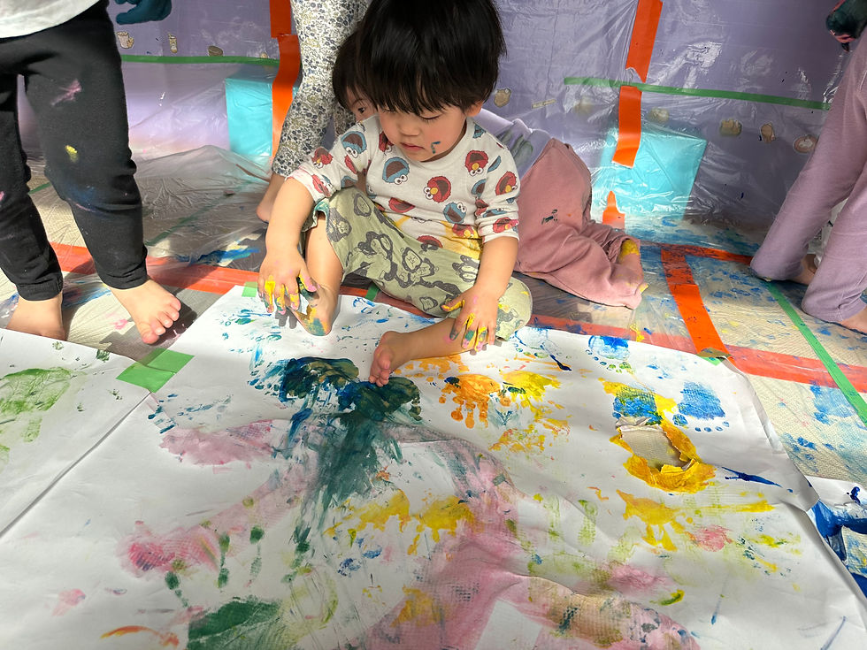 色が混ざり合う面白さや絵の具の感触を味わいながら活動を行うことができました😊